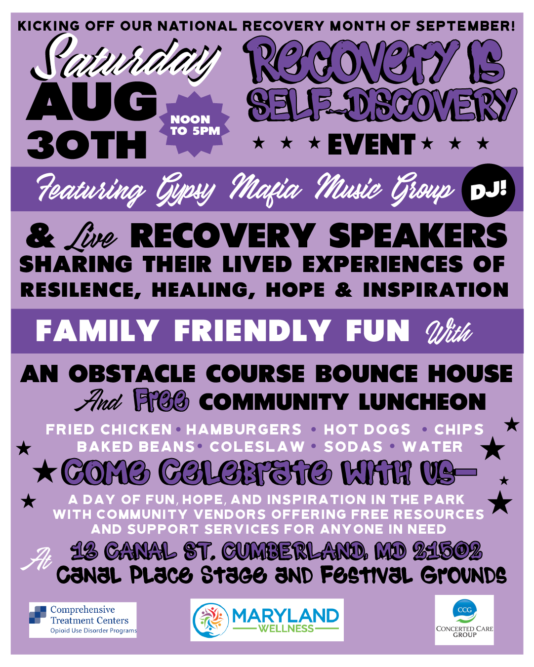 Maryland Wellness is holding an event, “Recovery is Self-Discovery” on August 30th from 12:00-5PM. at Canal Place Stage, 13 Canal St., Cumberland. Click here for more information.